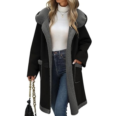 Women's Faux Suede Coat Sherpa Fleece Lined Oversize Duffle Coat Winter Mid-Length Hooded Toggle Jacket with Pockets